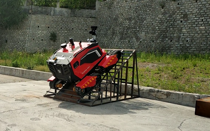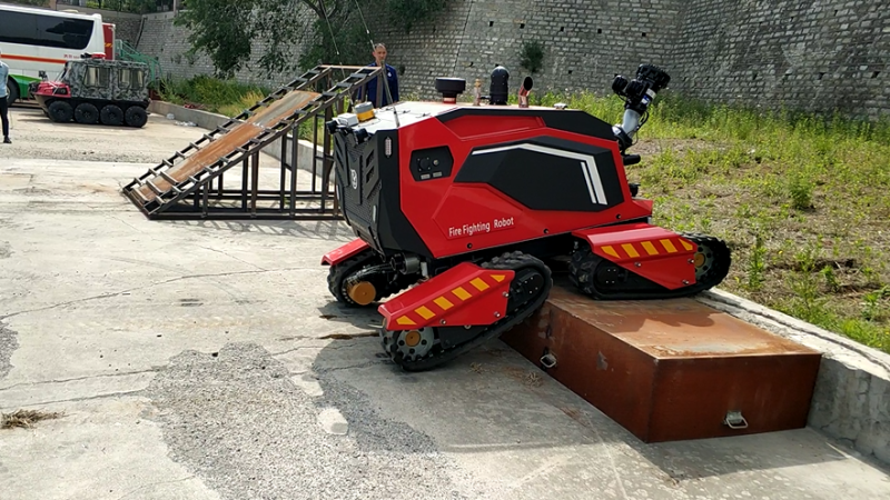 在驗收現(xiàn)場,根據(jù)山東消防救援總隊提出的驗收標準,與同行競品分別進行了垂直越障、S型行走、45度爬坡、單邊橋行進、拖拉水帶行走、射水距離、夜間盲操等性能測試。