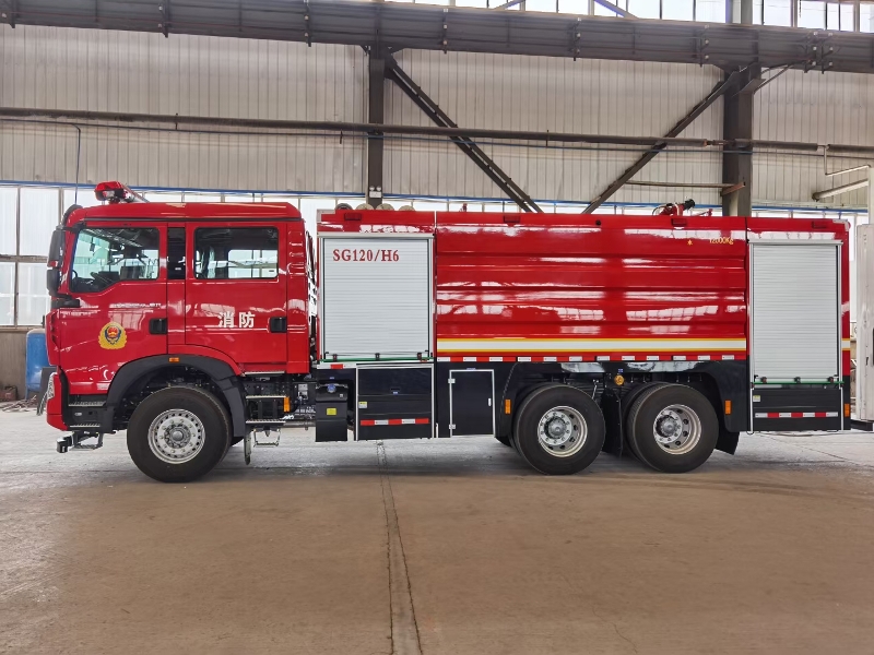 車輛底盤為豪沃ZZ5357TXFV464MF5底盤,發(fā)動機型號MC11.46-61,功率:341kw,國六排放標準,軸距4300mm+1400mm,罐體材質(zhì):優(yōu)質(zhì)碳鋼板;容罐容量:水12000kg; 消防泵為雄真CB10/60-XZ;消防炮為威斯特PS50W。